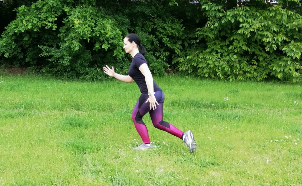 Protože je při běhu třeba, aby koleno vyrovnávalo dopad z letové fáze, bez poskoků to v posilování fakticky nepůjde. Začínáme v pozici naznačeného výpadu vzad (obr. 4). Odrazte se ze zadní nohy, vyskočte nahoru (obr. 5), dopadněte a dobrzděte zpět do výchozího postavení. Pro fajnšmekry máme variantu, při které je zadní noha stále ve vzduchu a cvik se provádí s kontaktem pouze nohy přední. Komu ujede koleno směrem dovnitř, jde se do nejbližšího kouta (či křoví) stydět.