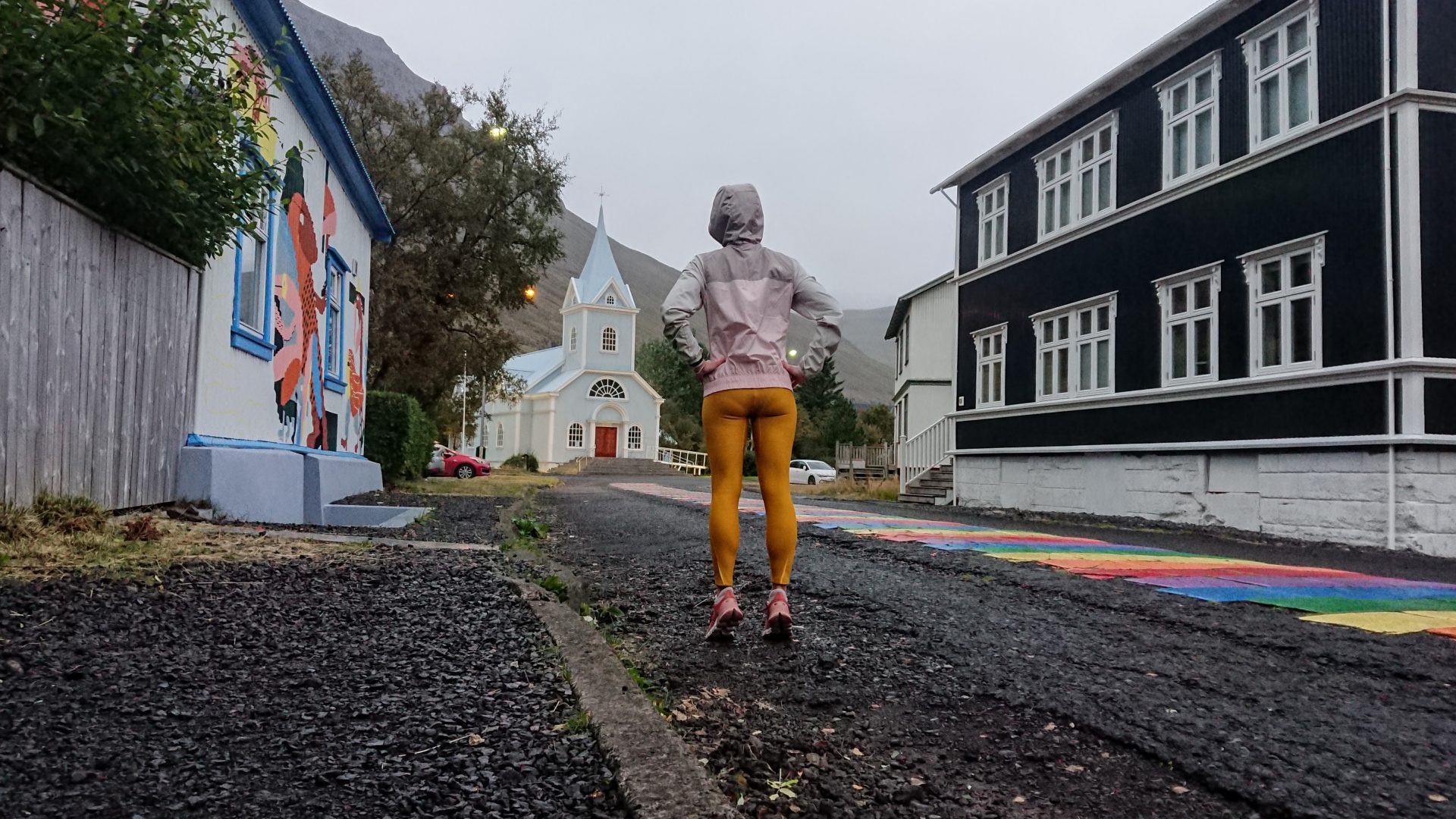 Městečko Seyðisfjörður je nejbarevnějším (a já dodávám jediným barevným) městem na ostrově. Působí tady umělci, natrefíte tu na dobré restaurace i obchody pro cestující z trajektu. Pravda ale, že fjord obklopený horami funguje jako trychtýř, takže běžec v jeho ústí schytává to nejhorší. Taky se zde potvrzují legendy o pověstném islandském vodorovném dešti. Nakonec jsem hodně pyšná, že v téhle slotě uběhnu pět kilometrů tempem 5:16 a pouhou minutu za osobním rekordem. Cestou potkávám pouze dva lidi, zaměstnance přístavu, kteří působí, jako by šlo o jejich první setkání s běžcem.